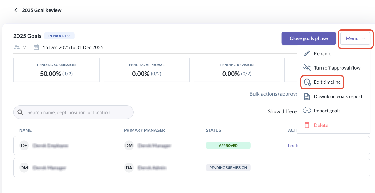The Edit Timeline action is available from the Goal Phase Details page via the Menu dropdown.