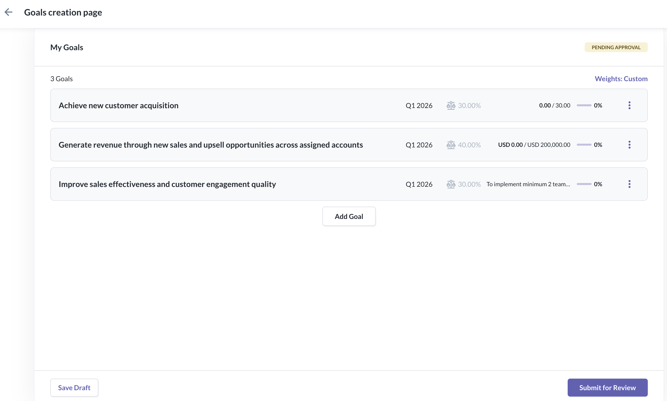 - Once the Employee submits their goals, the status will appear as Pending Approval