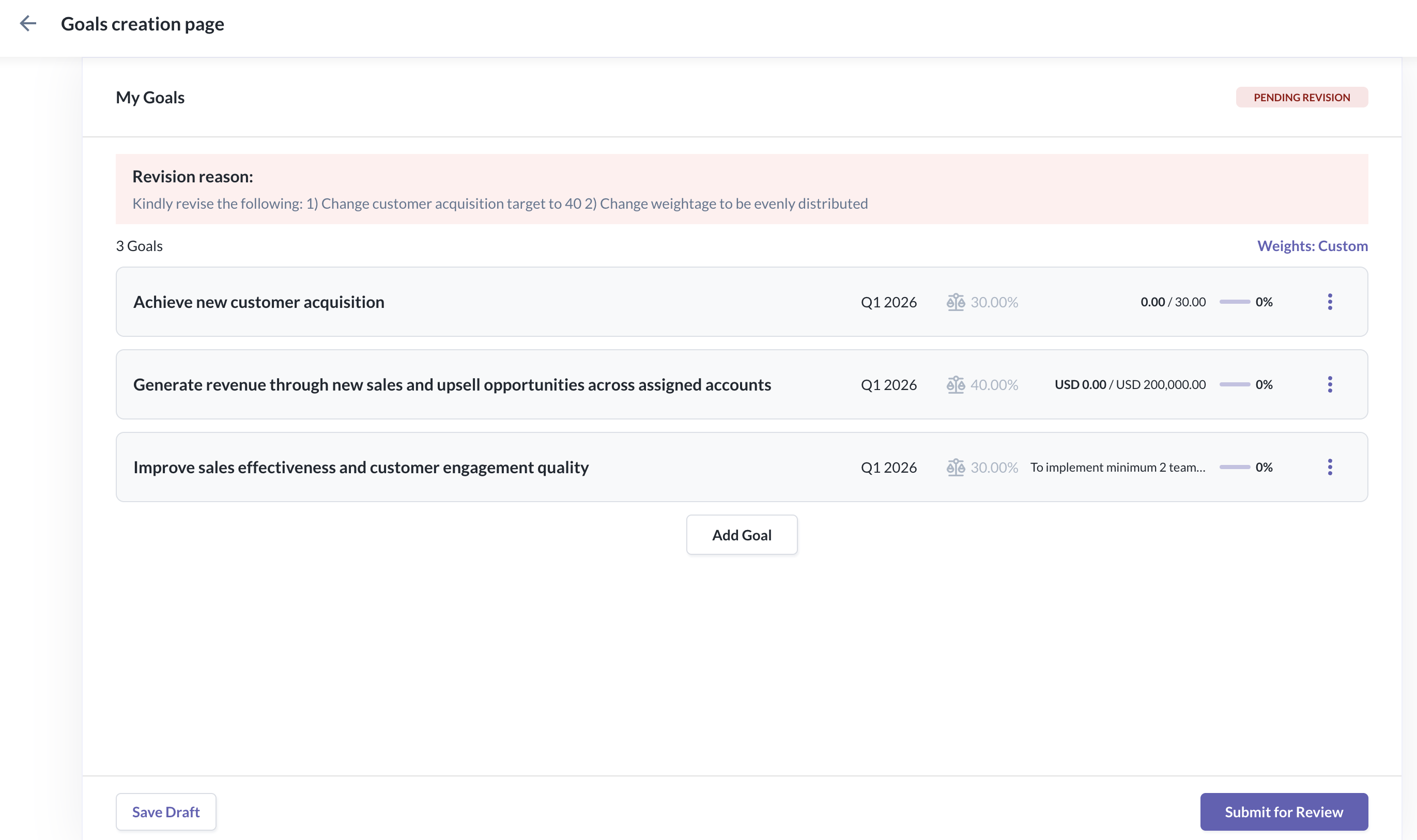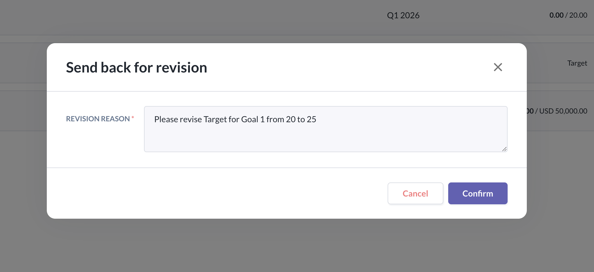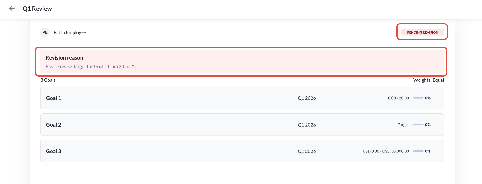 - The revision reason will be visible while the Goal status is Pending Revision, Pending Submission and Pending Approval