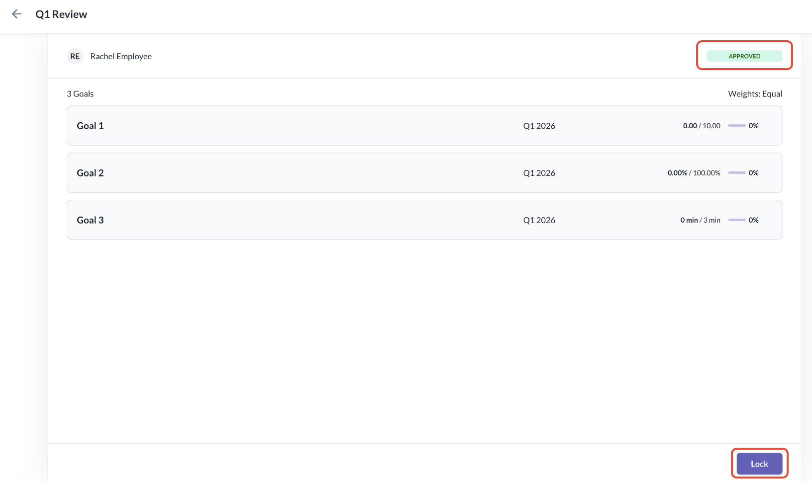 - If the Manager clicks Lock on the Employee's Goal, it will immediately lock and the Lock icon will also appear beside the Goal status