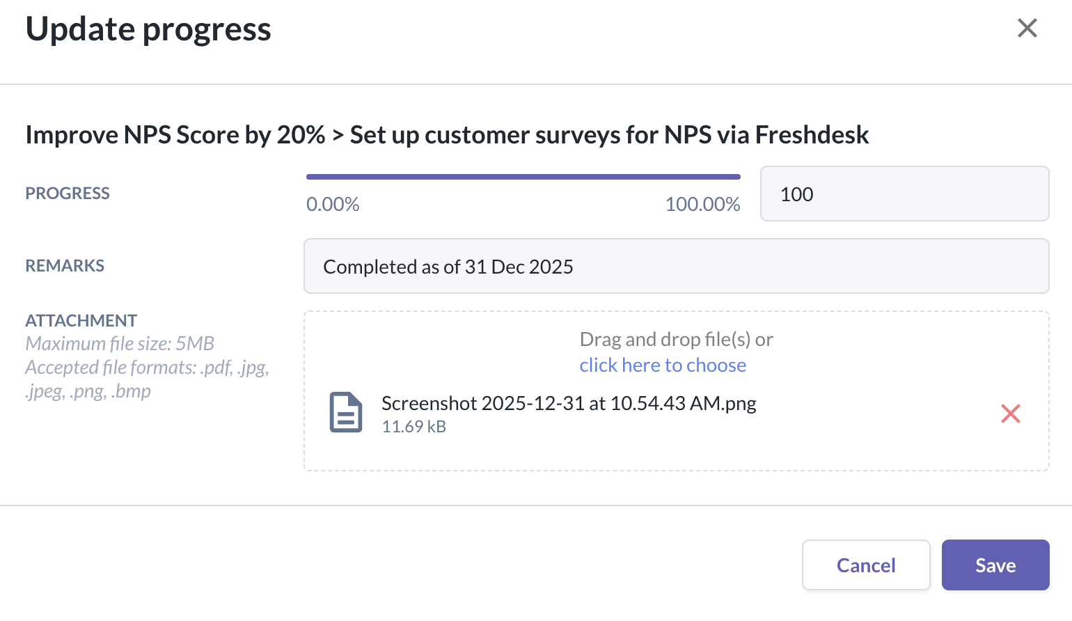 - To update the progress, fill in the fields such as the progress value, remarks & any attachments to support the update.