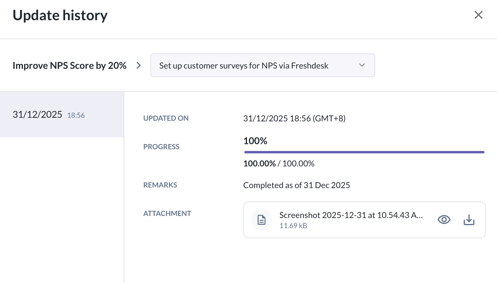 - You can click on the clock icon to view the history of all the progress updates done for the particular goal & sub-goal.