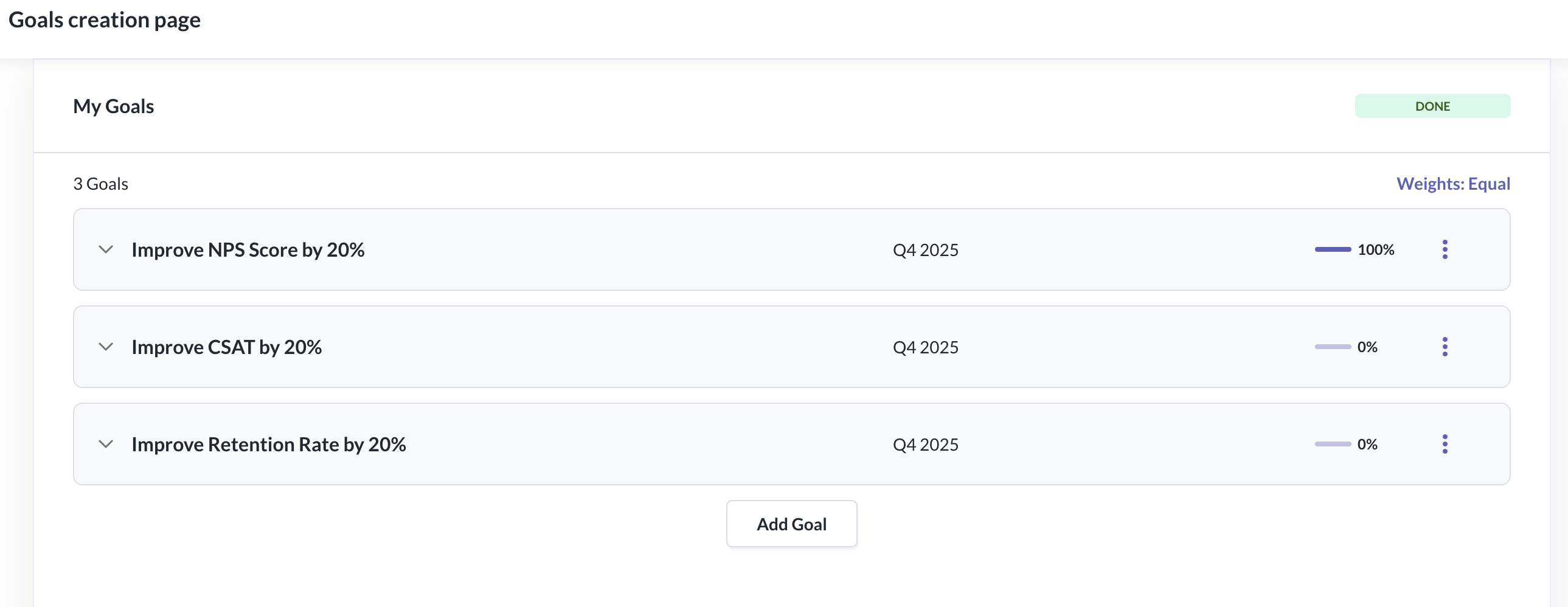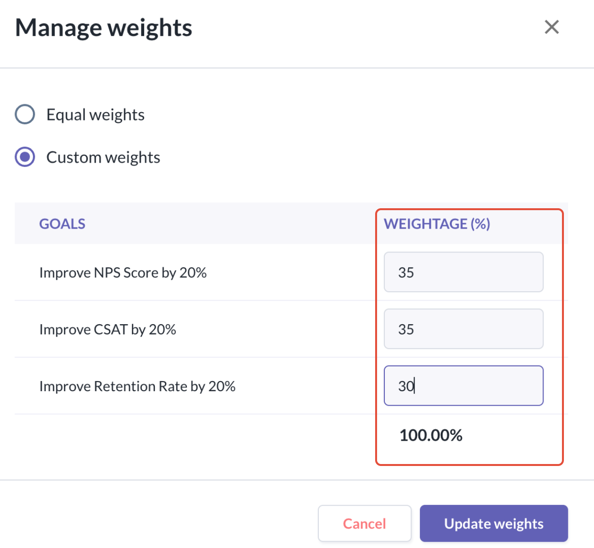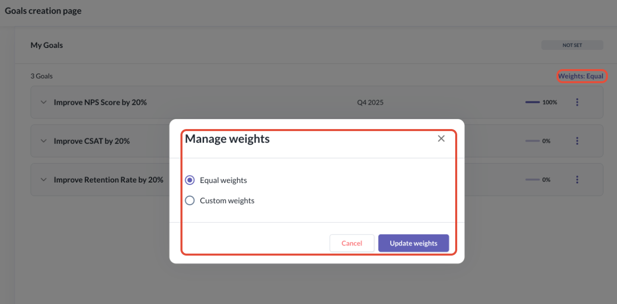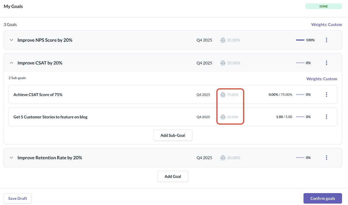 If you wish to edit and update the weightage of goals & sub-goals you have created, you will be able to do so. You can either configure the weightage to be equal or have a custom weightage setting.