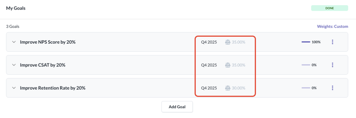 - If any goals or sub-goals are added or removed, the system will auto-distribute the weights again