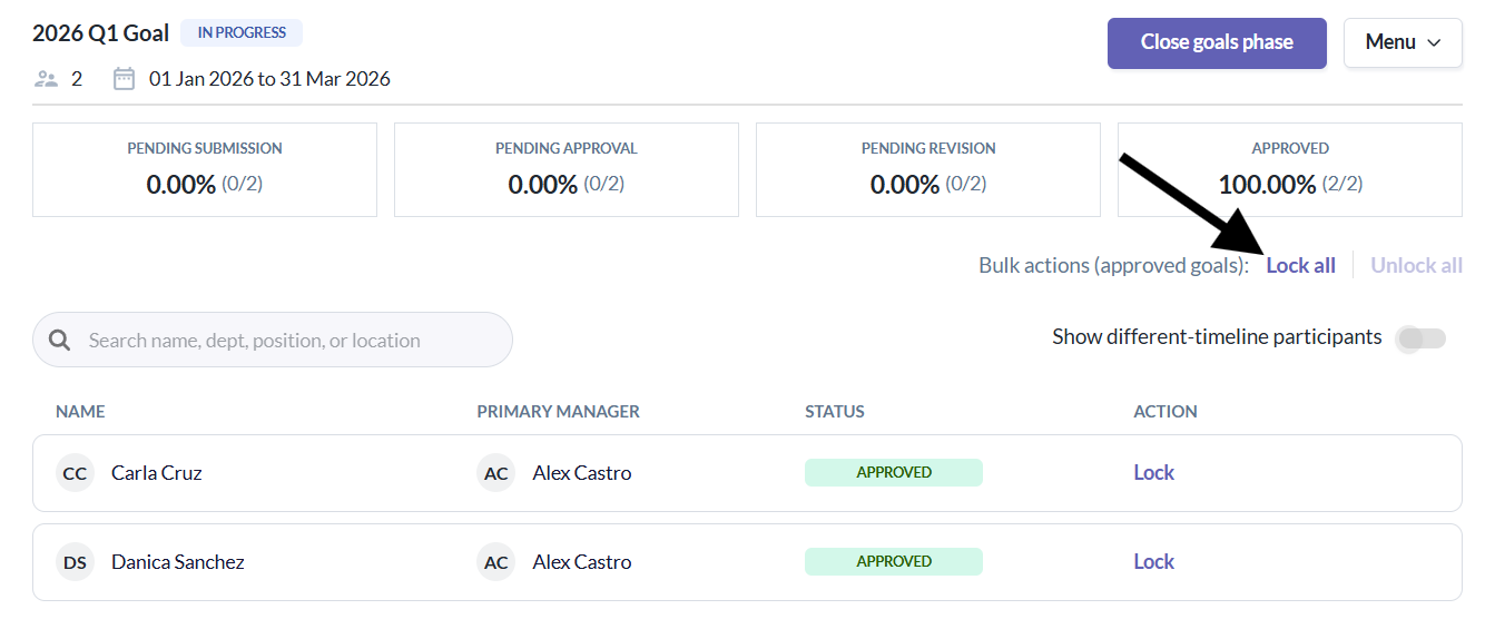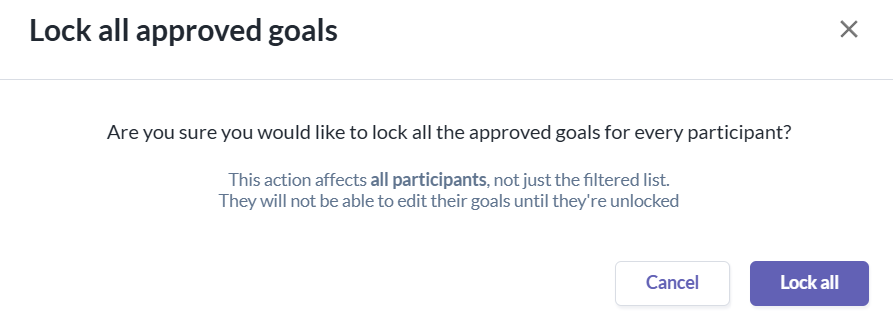 - Admins/Managers can lock the goals of all participants whose goals are in "Approved" status.