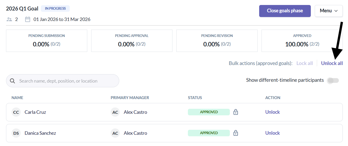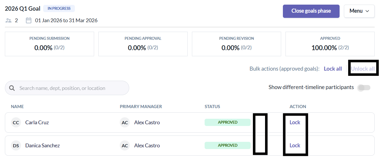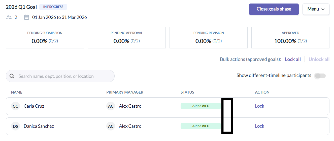 - Admins/Managers can lock or unlock the approved goals of a specific participant.