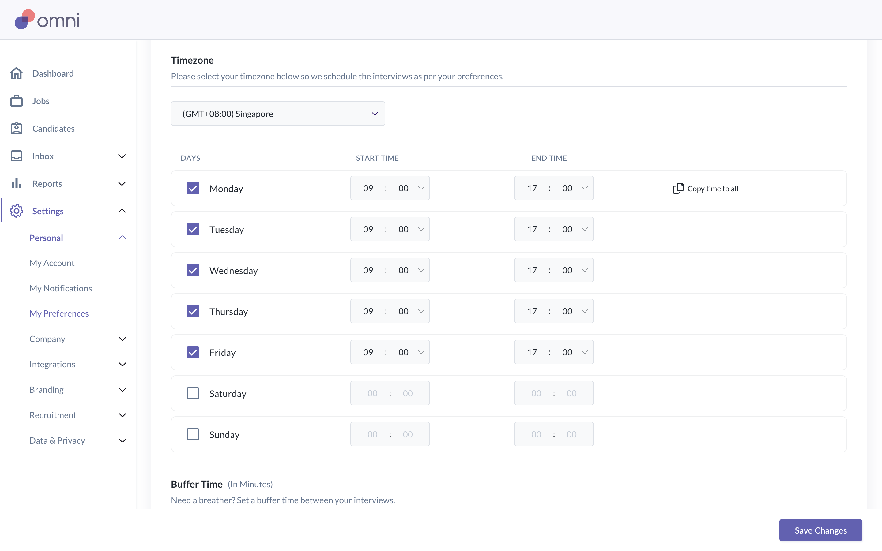 After connecting your calendar, you need to set your interview availability. Interview slots will only be offered within your availability and when you are free on your calendar.