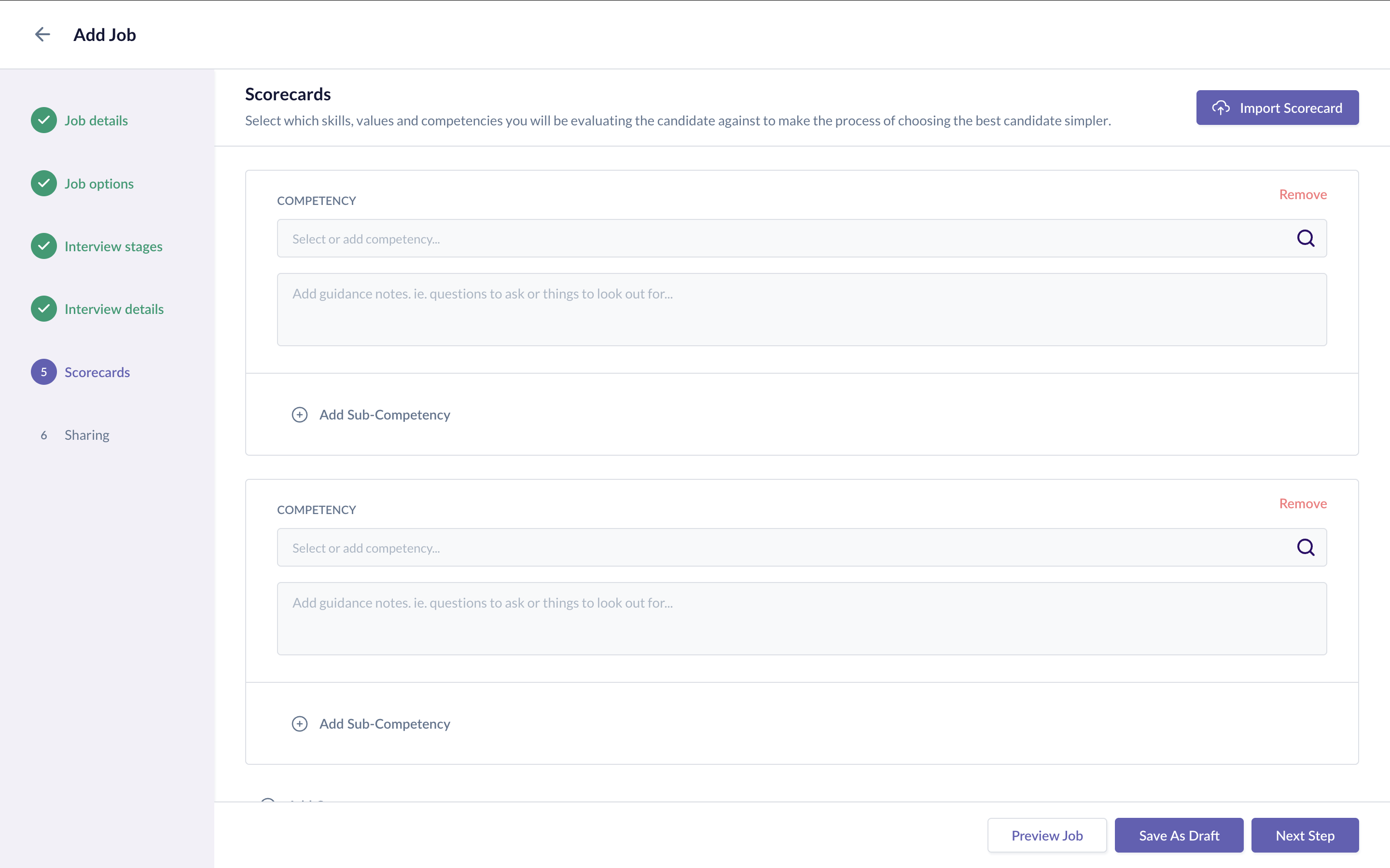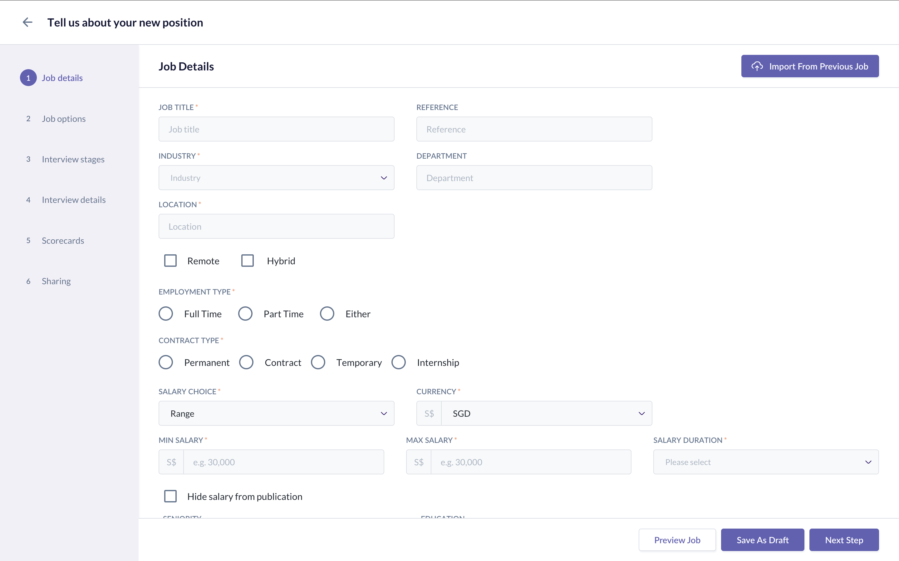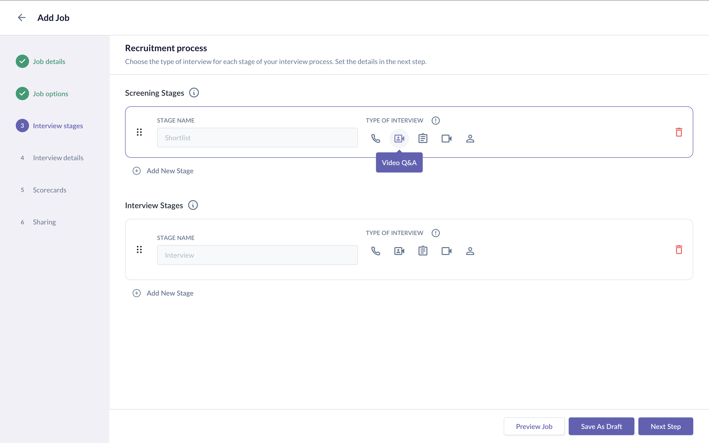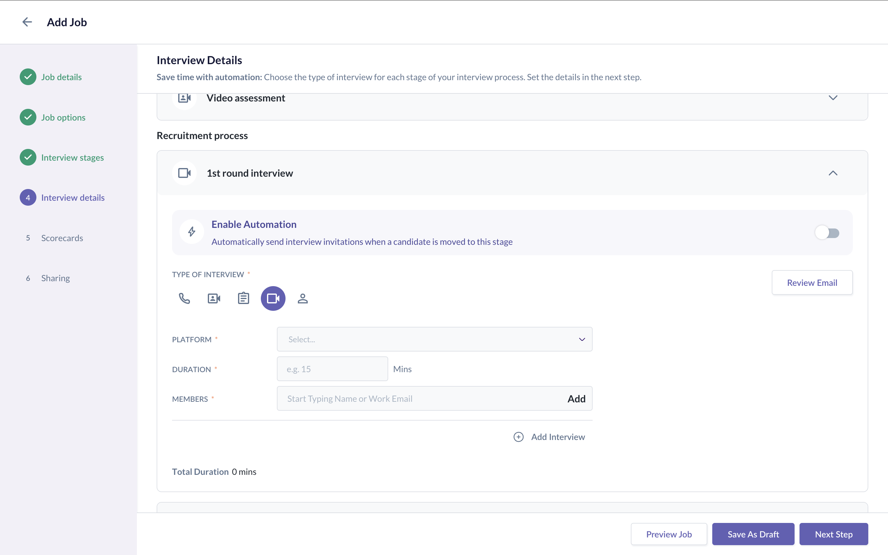 Interview details are configured based on the interview stages selected in the previous step. Each stage type requires different information to be completed before candidates can move forward.