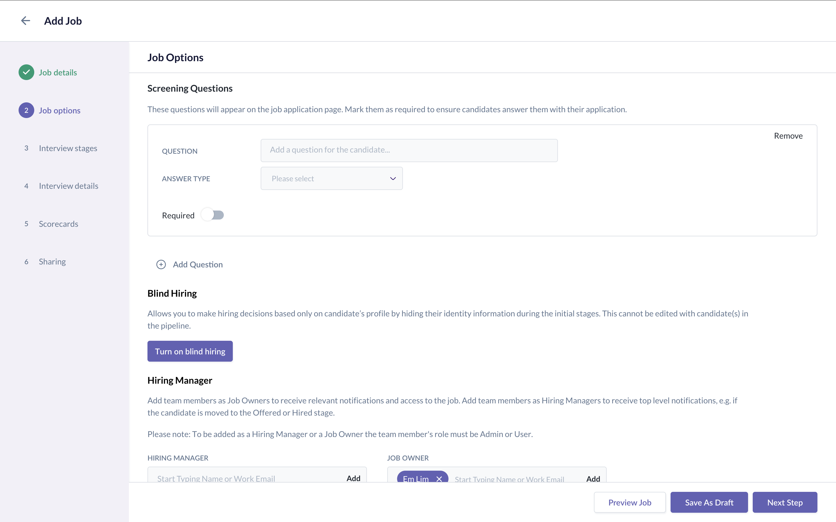 Job options define ownership, responsibilities, and any screening required before candidates move forward.