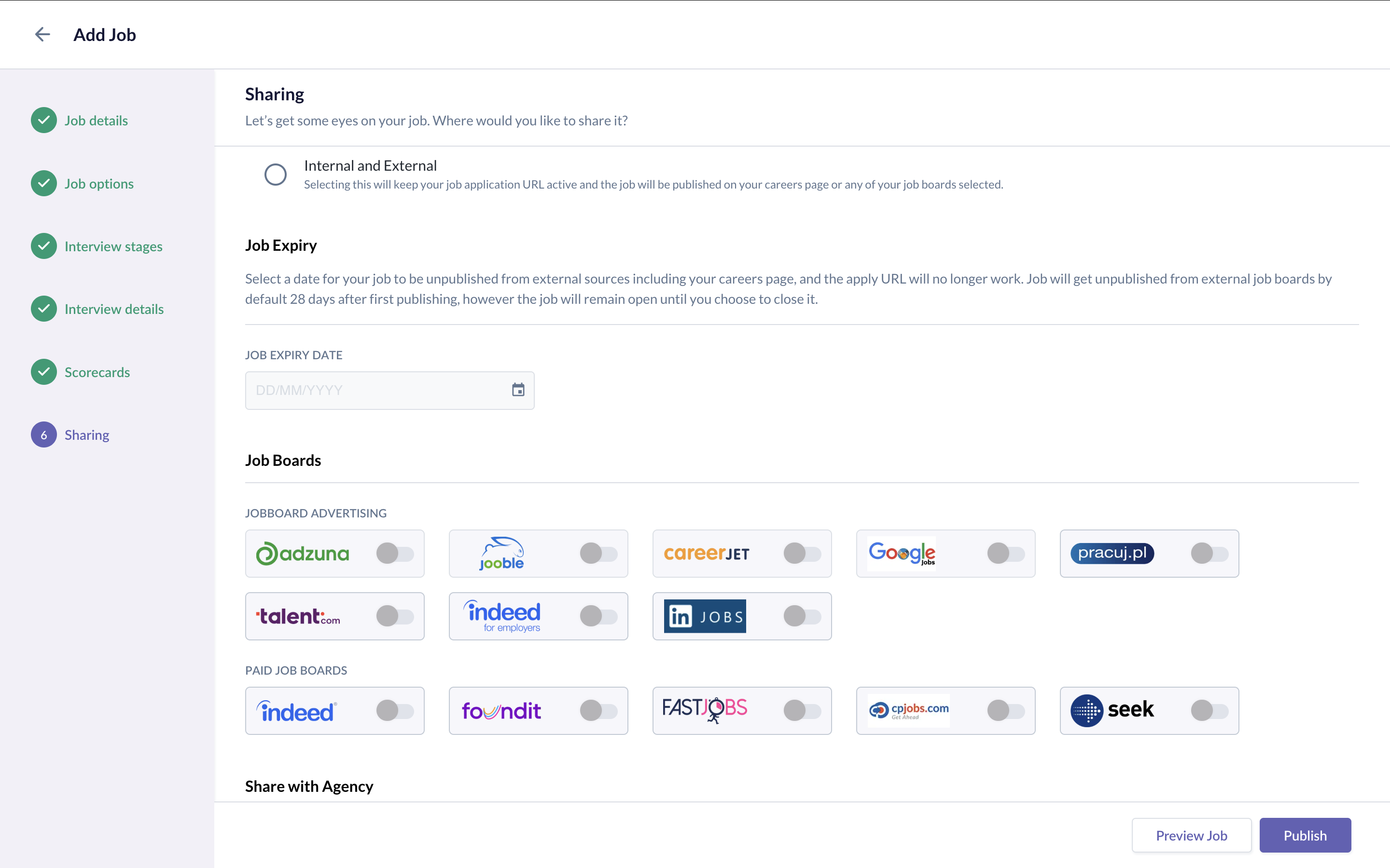 Jobs are created in the Recruit module to start a hiring process. The job creation flow guides you through defining job details, configuring the hiring workflow, and deciding how the job is shared.