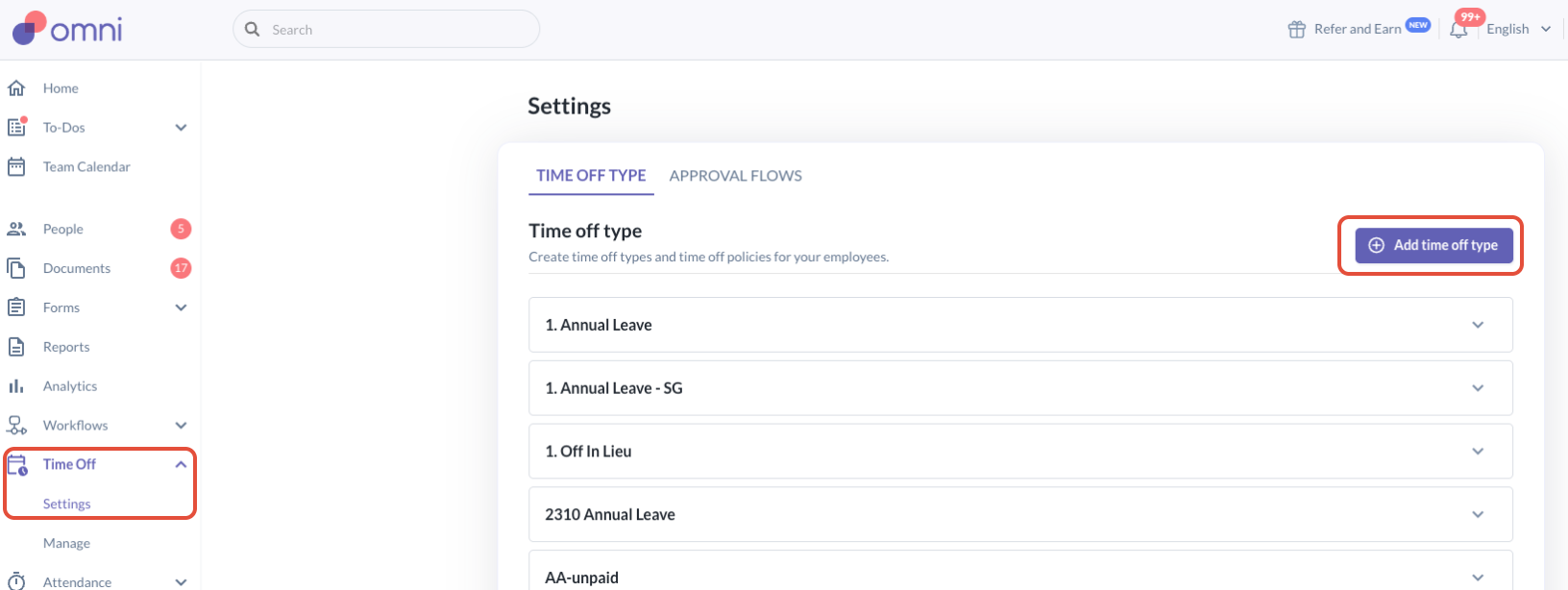 Step 1: Go to Time Off > Settings > Add Time Off Type