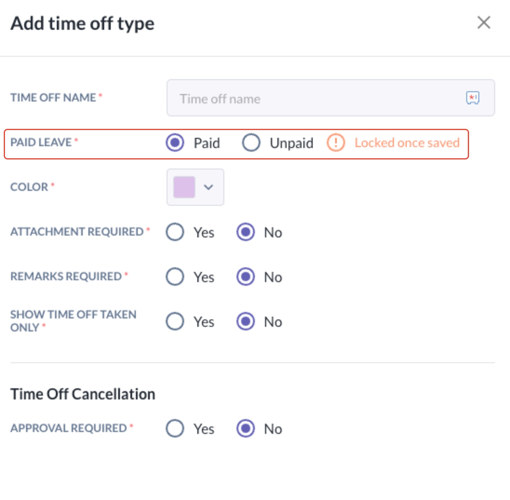 - If you need to change an existing time off type from paid to unpaid (or vice versa), we will advise you to create a new time off type with the correct paid or unpaid setting.