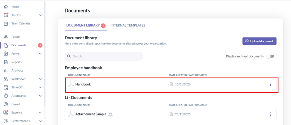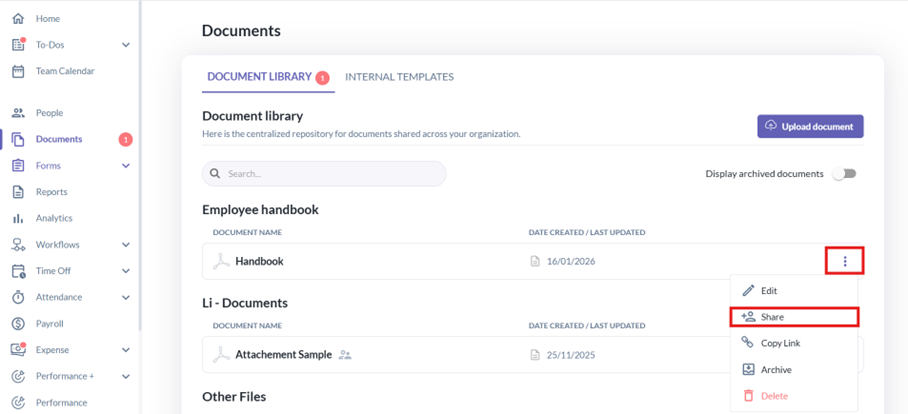 - Follow the guide here: [Uploading and Sharing Documents in Document Library]