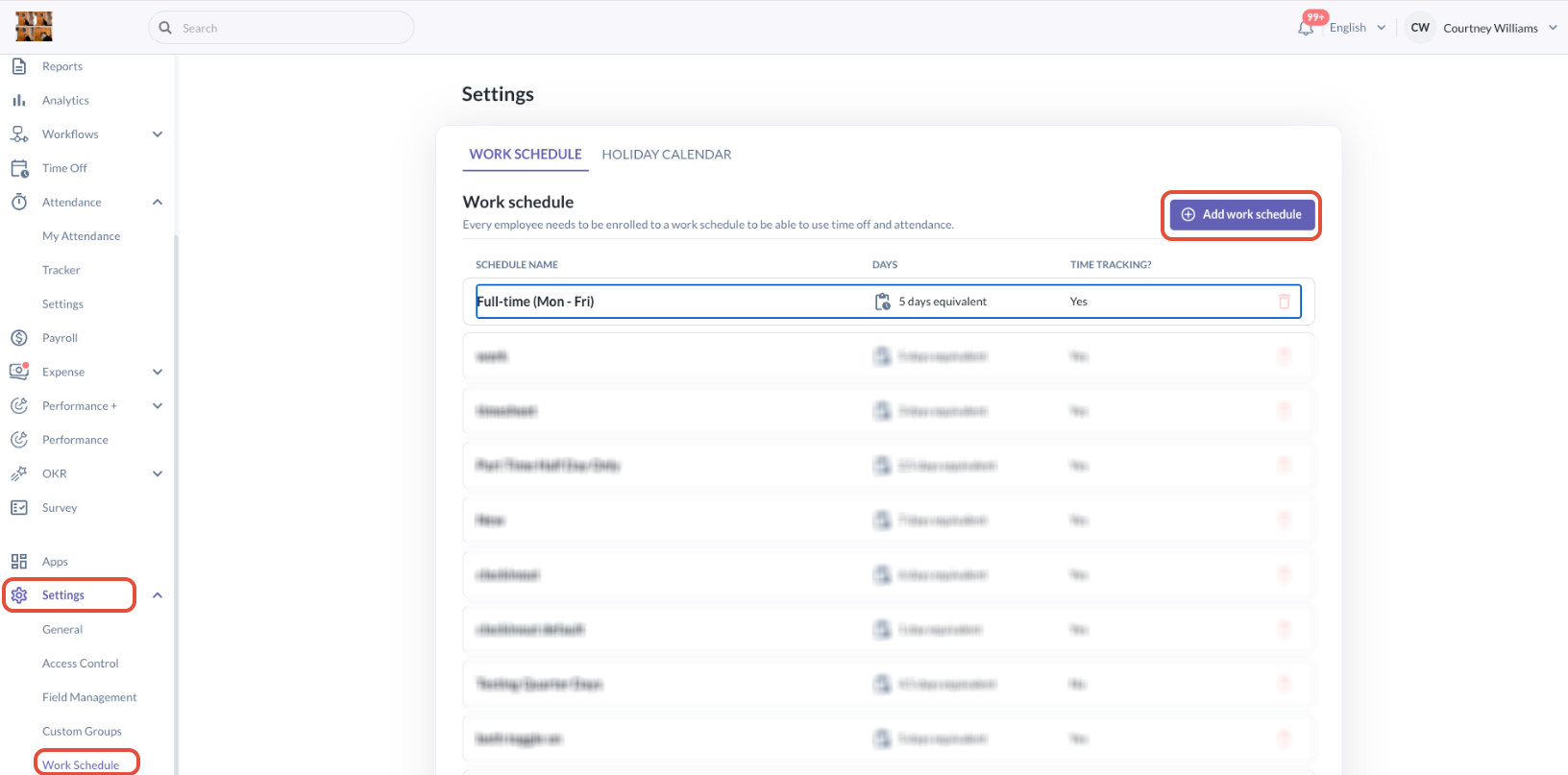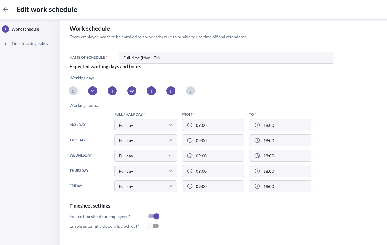 - Go to Settings > Work Schedule > Add Work Schedule or Edit an existing Work Schedule i.e. Full-time (Mon - Fri)