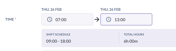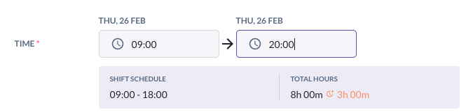 (a) If she CI at 9.00AM but CO at 8.00PM, her total hours worked are: 11 hours [9 Hours shift hours, 2 Hours OT]. You can see the indication of OT hours in orange under Total Hours below.