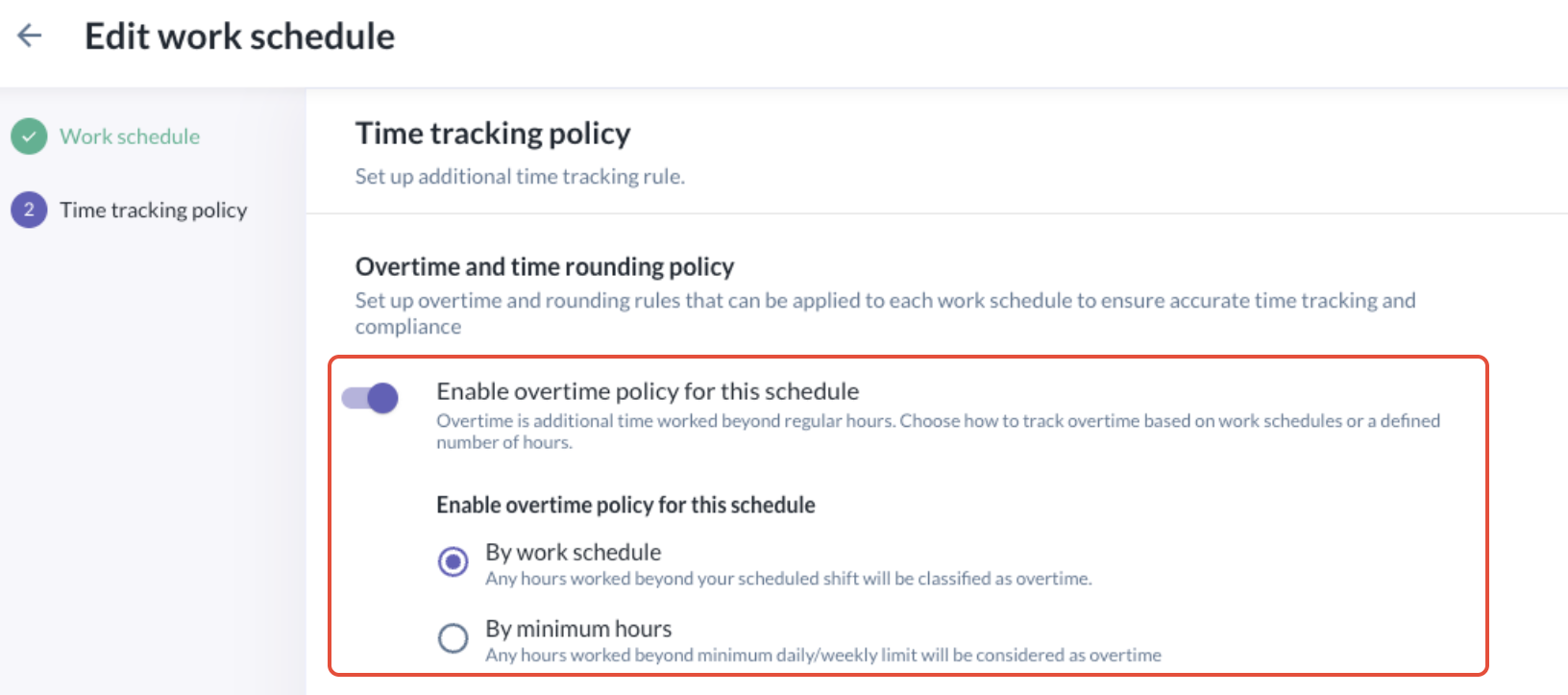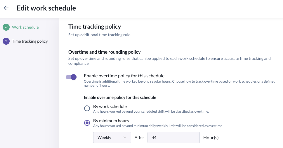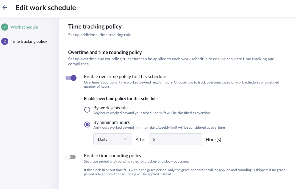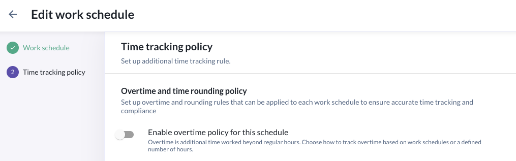 - Under time tracking policy, turn on "Enable overtime policy for this schedule". When this is enabled, you will see two options to enable for the specific schedule: