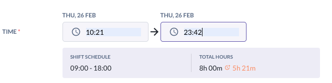 (b) If she CI late at 10:21 AM and CO late at 11:42 PM, her total hours worked are: 13h 21m but you will see that the regular hours tracked are 8 hours, and the OT has been calculated for 5h 21m
