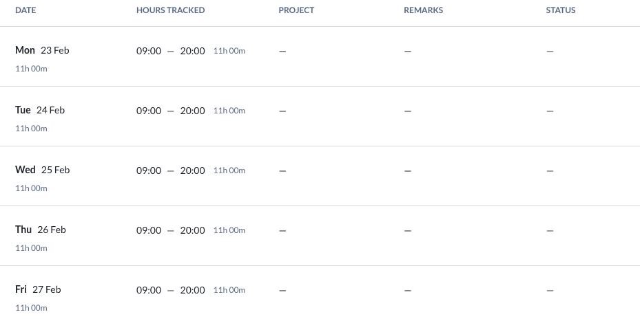 - If you do not setup the overtime policy, the hours will be tracked as follows: