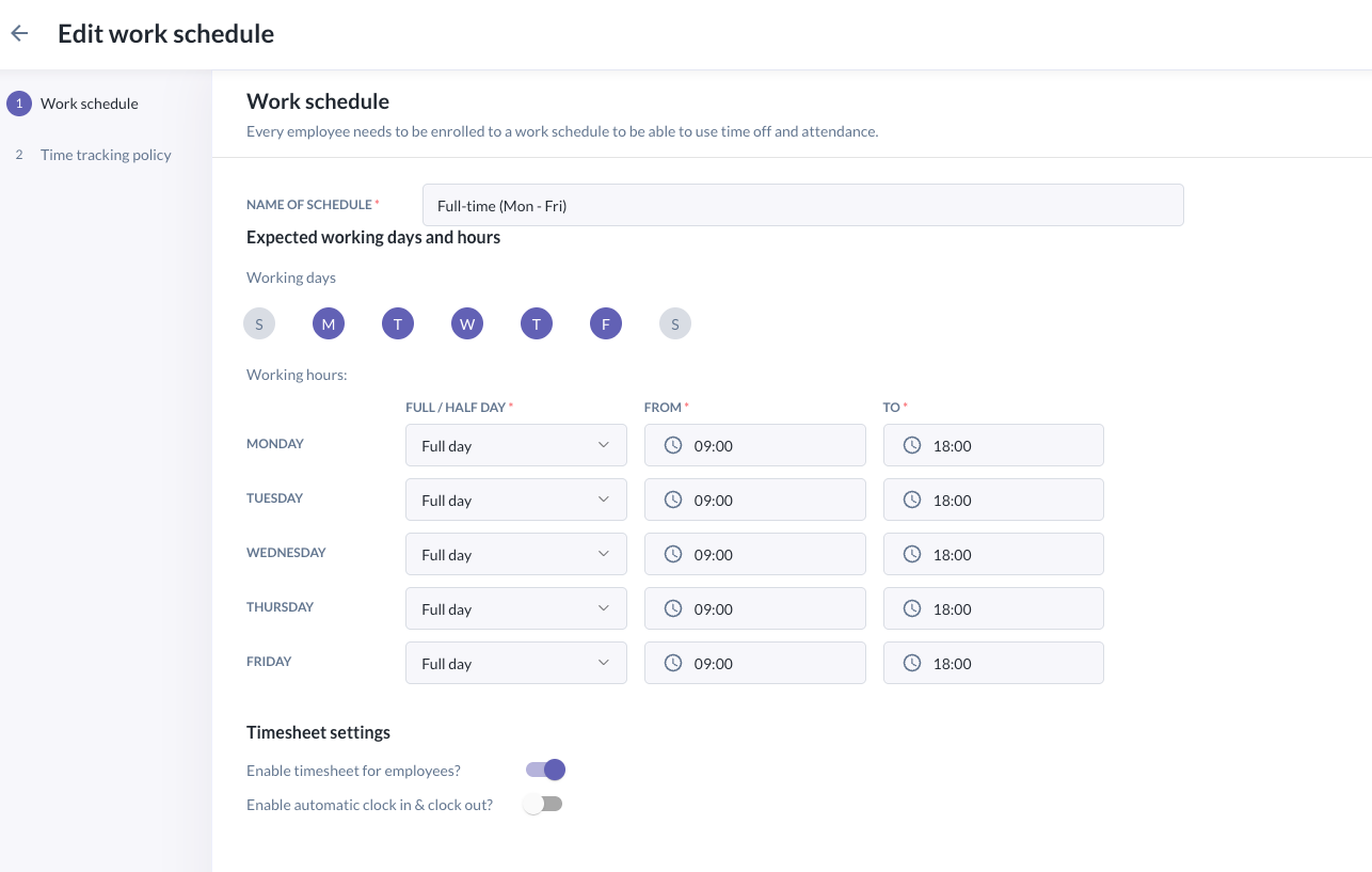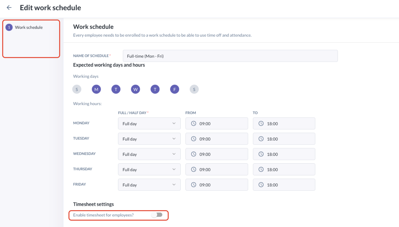 - Go to Settings > Work Schedule > Add Work Schedule or Edit an existing Work Schedule i.e. Full-time (Mon - Fri)