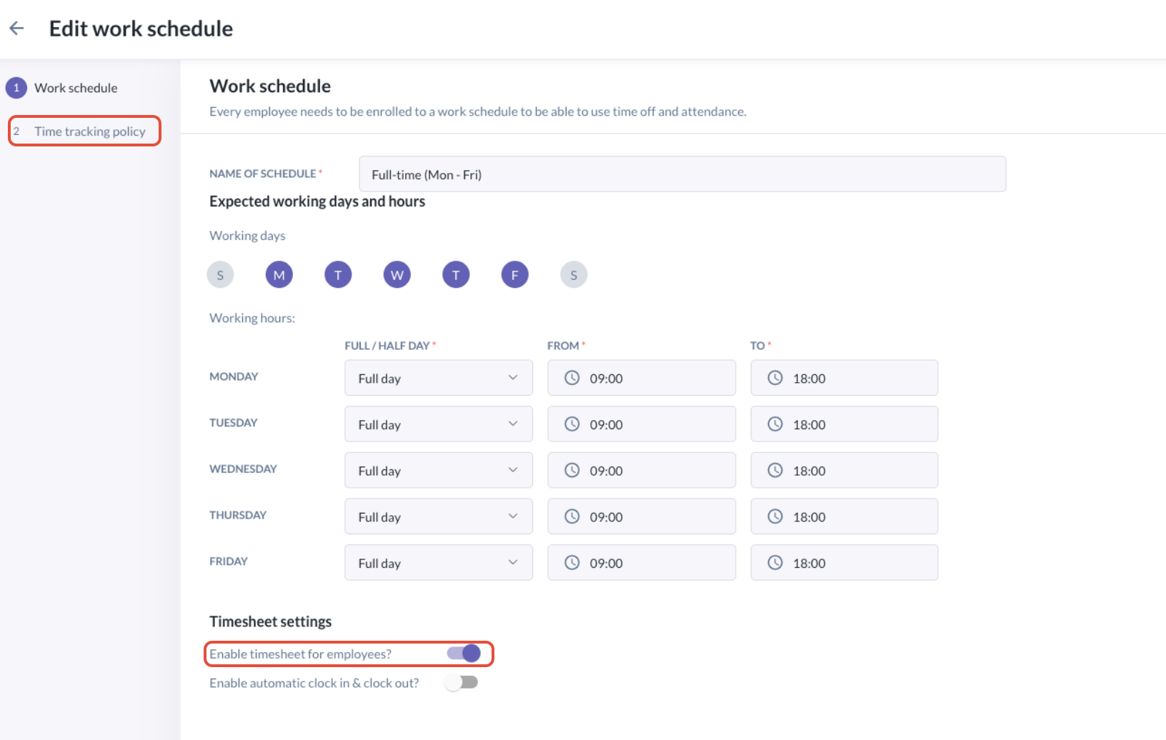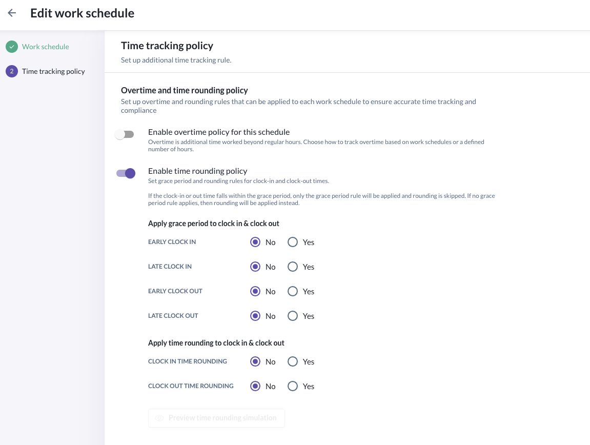 - If this is turned off, you will not be able to setup a time tracking policy for this work schedule.