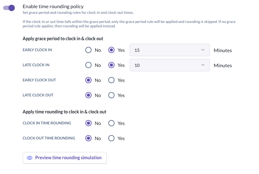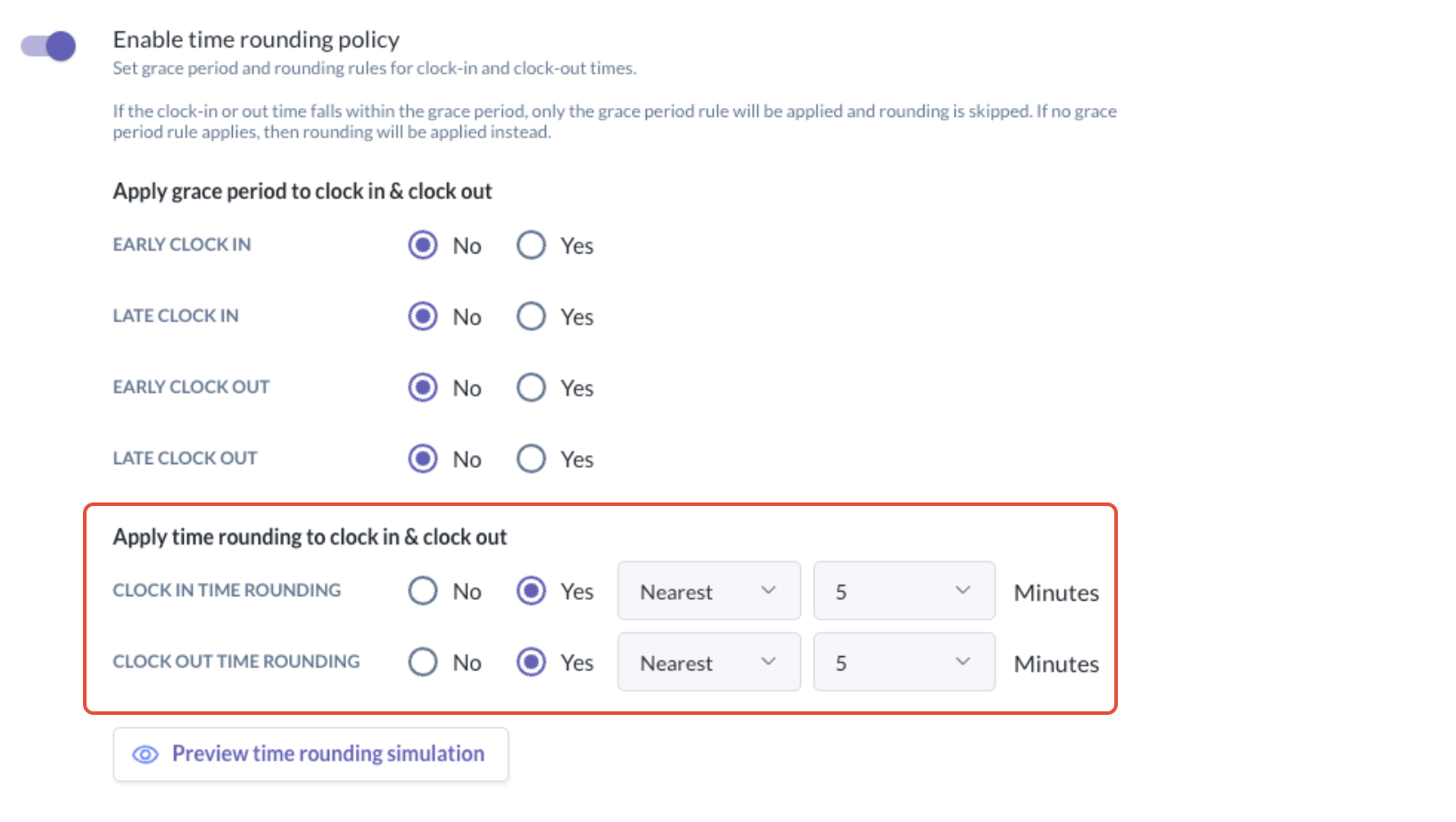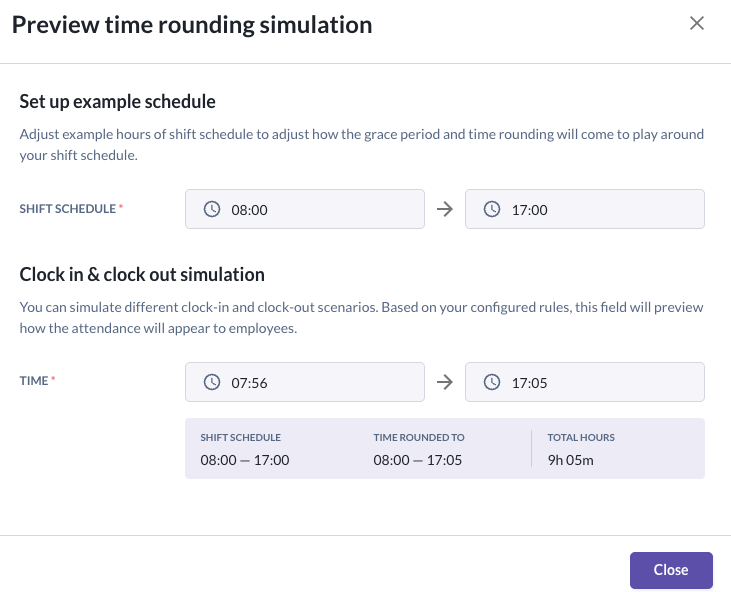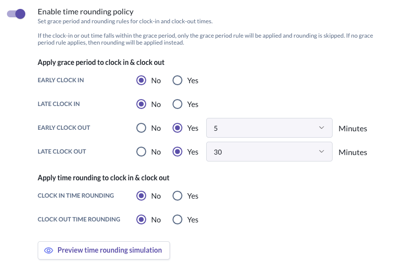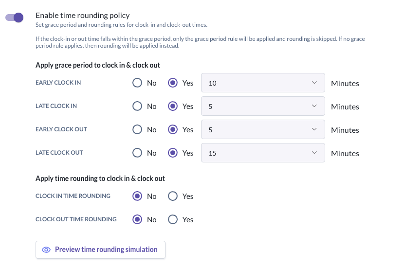 Tip: Use the preview time rounding simulation feature to visualise how the grace period & time rounding settings will apply in simulated clock in & out scenarios before saving