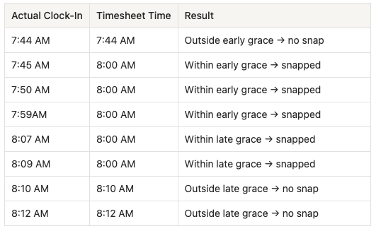 Result: If clock-in time falls between 7:45:00 AM and 8:09:59 AM, timesheet time will snap to shift start time (8:00 AM)