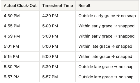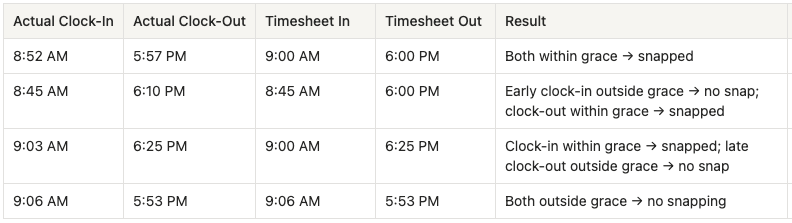 - A grace period allows small early/late clock-ins or clock-outs to “snap” to the scheduled shift time.