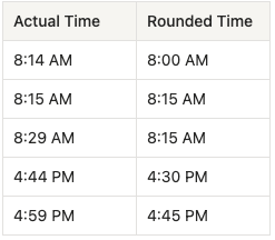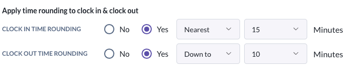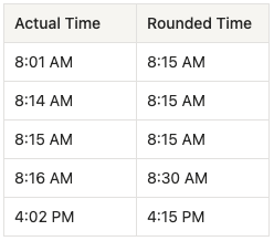 - Apply time rounding to clock in & clock out: Rounding standardises clock-in/out times to consistent intervals.