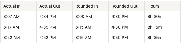 - Rounding direction per side matters more than people expect — having hours worked rounded to a consistent interval makes payment of salaries much easier.
