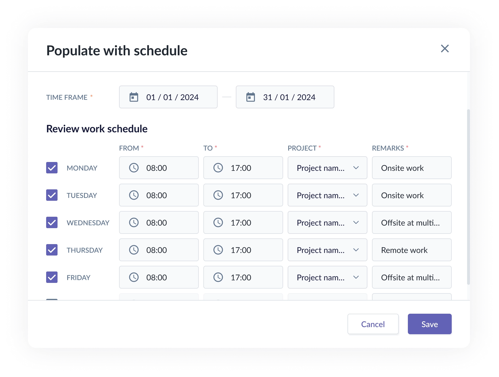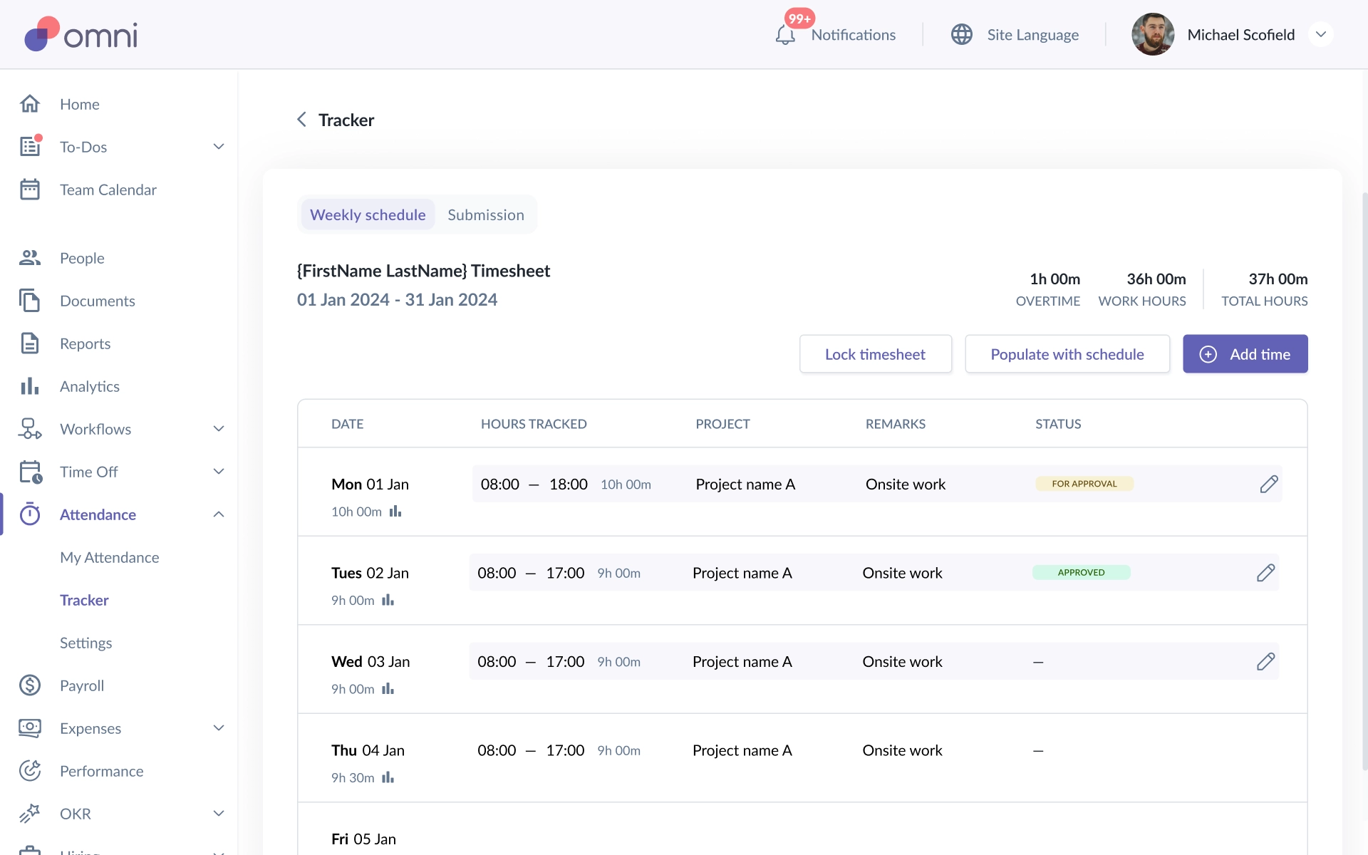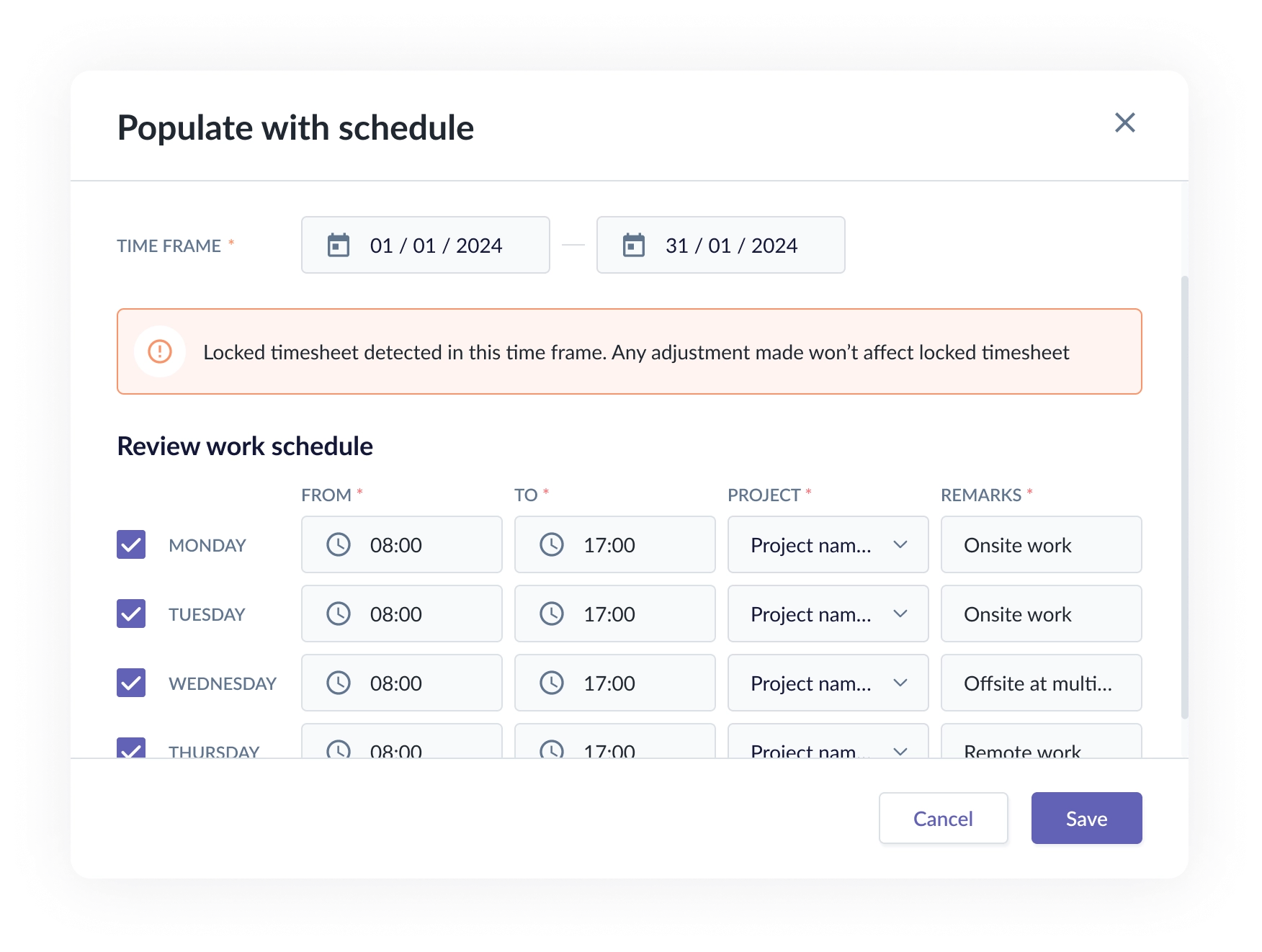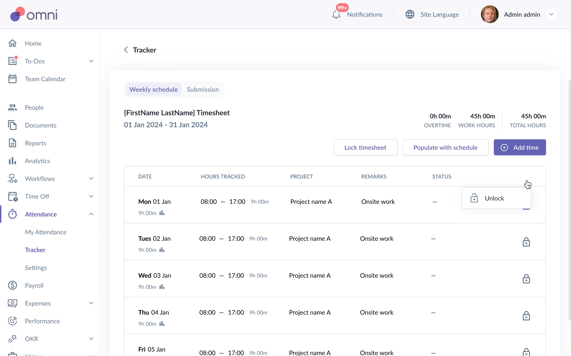 Before locking a timesheet, Admins can use Populate with schedule to generate timesheet entries based on the assigned work schedule.