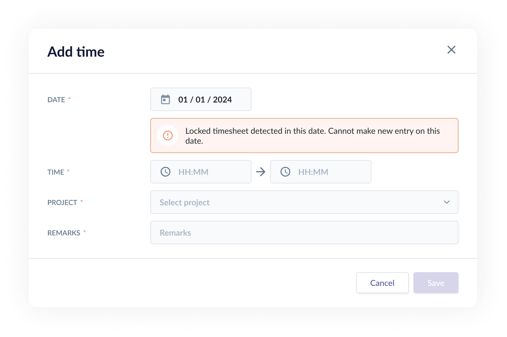 - Fail! Timesheet is locked on the date of imported record