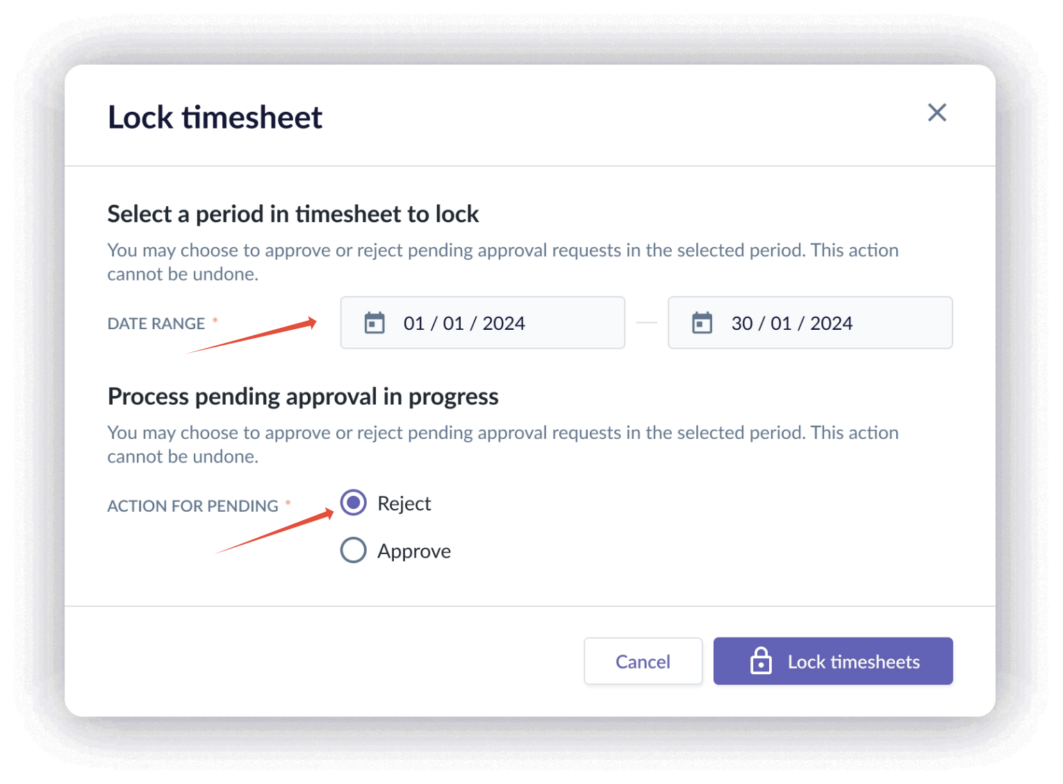 When locking a timesheet, the Admin must select: