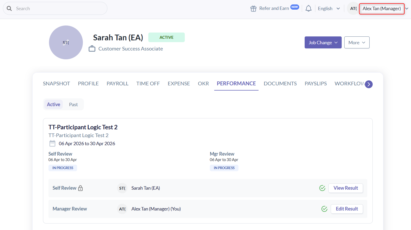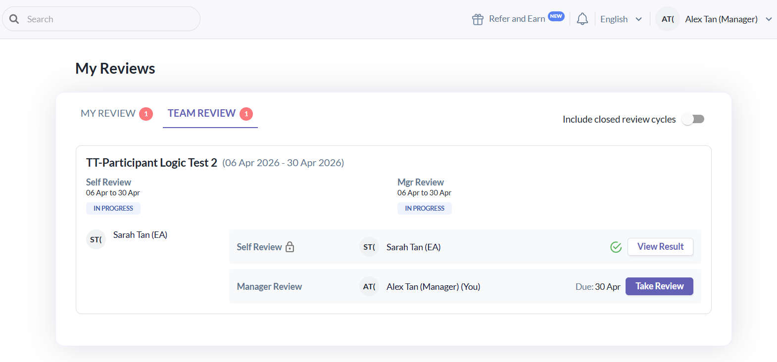 | Alex | Manager | Reviewee & Reviewer | Can view own results and Sarah’s review |
