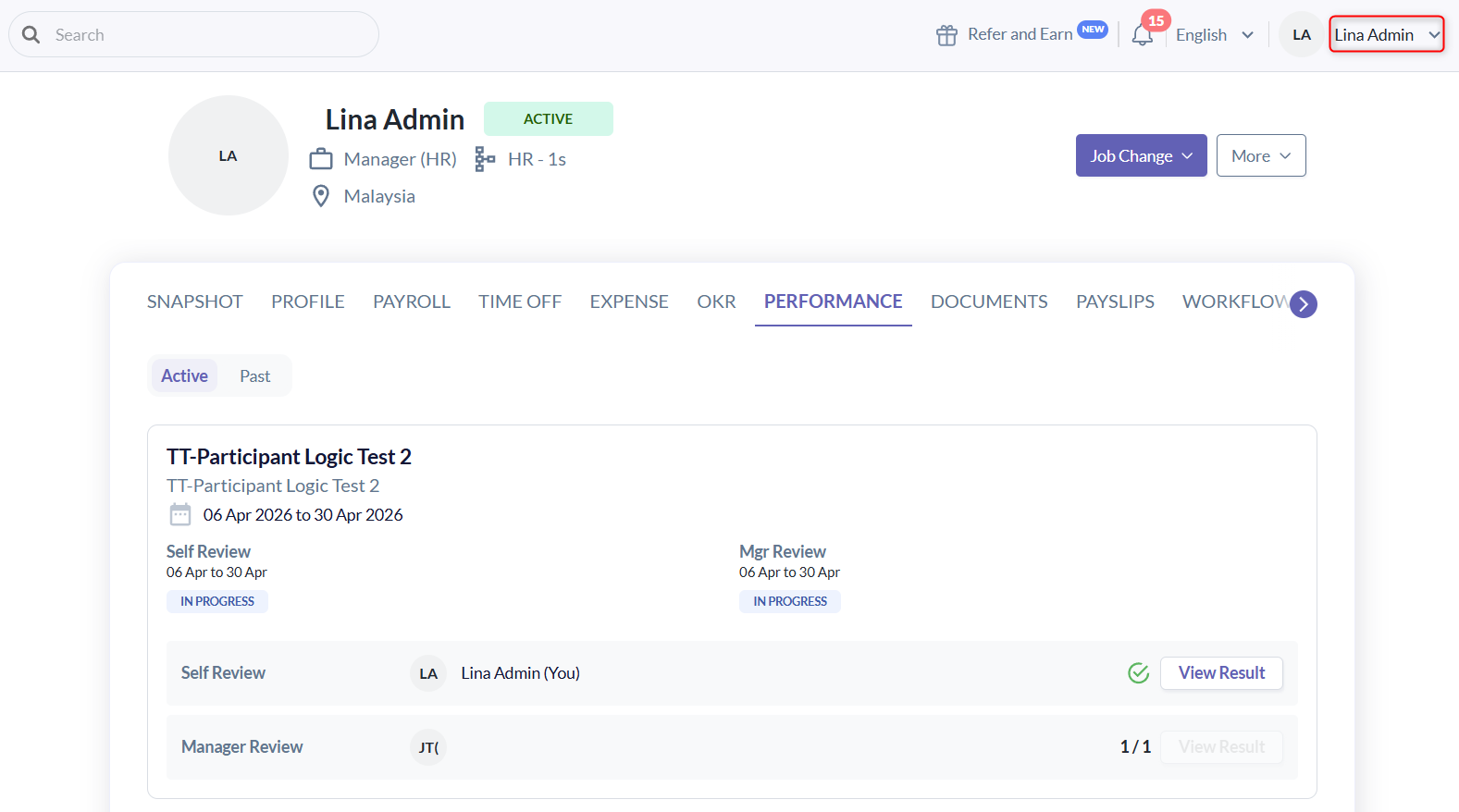 | Lina | Admin | Reviewee | Can view own results only |