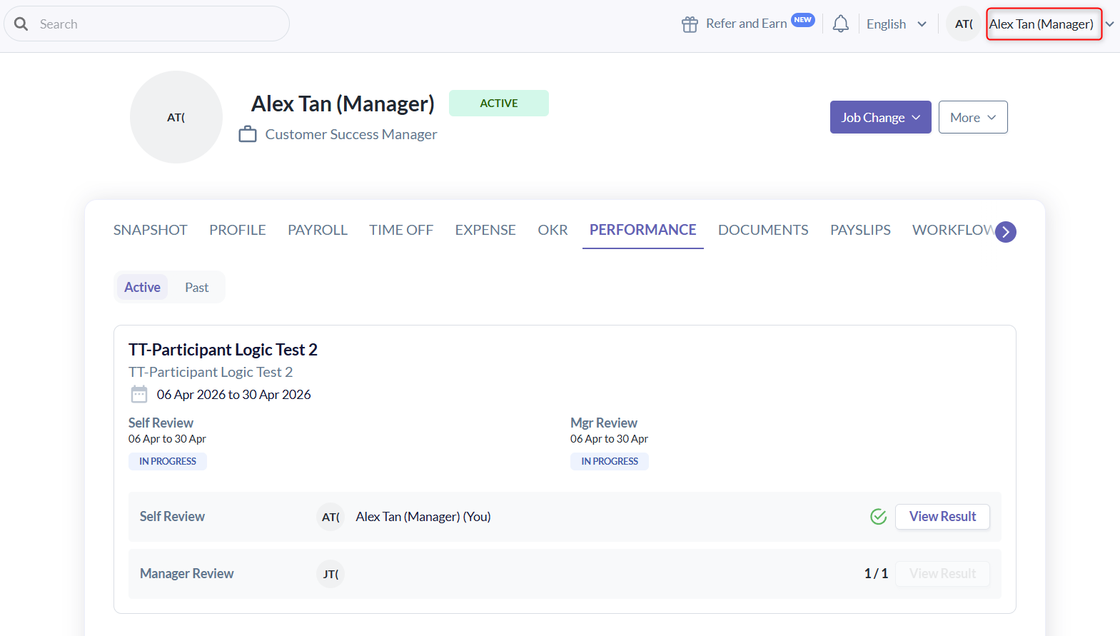 - Alex is both a Manager and a participant (reviewee & reviewer).