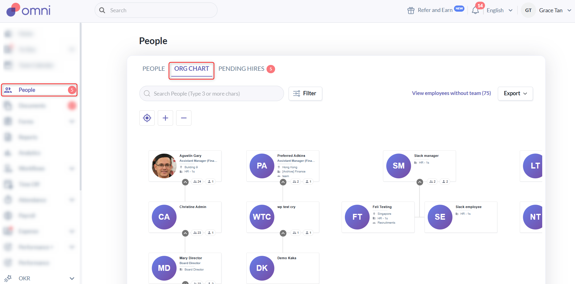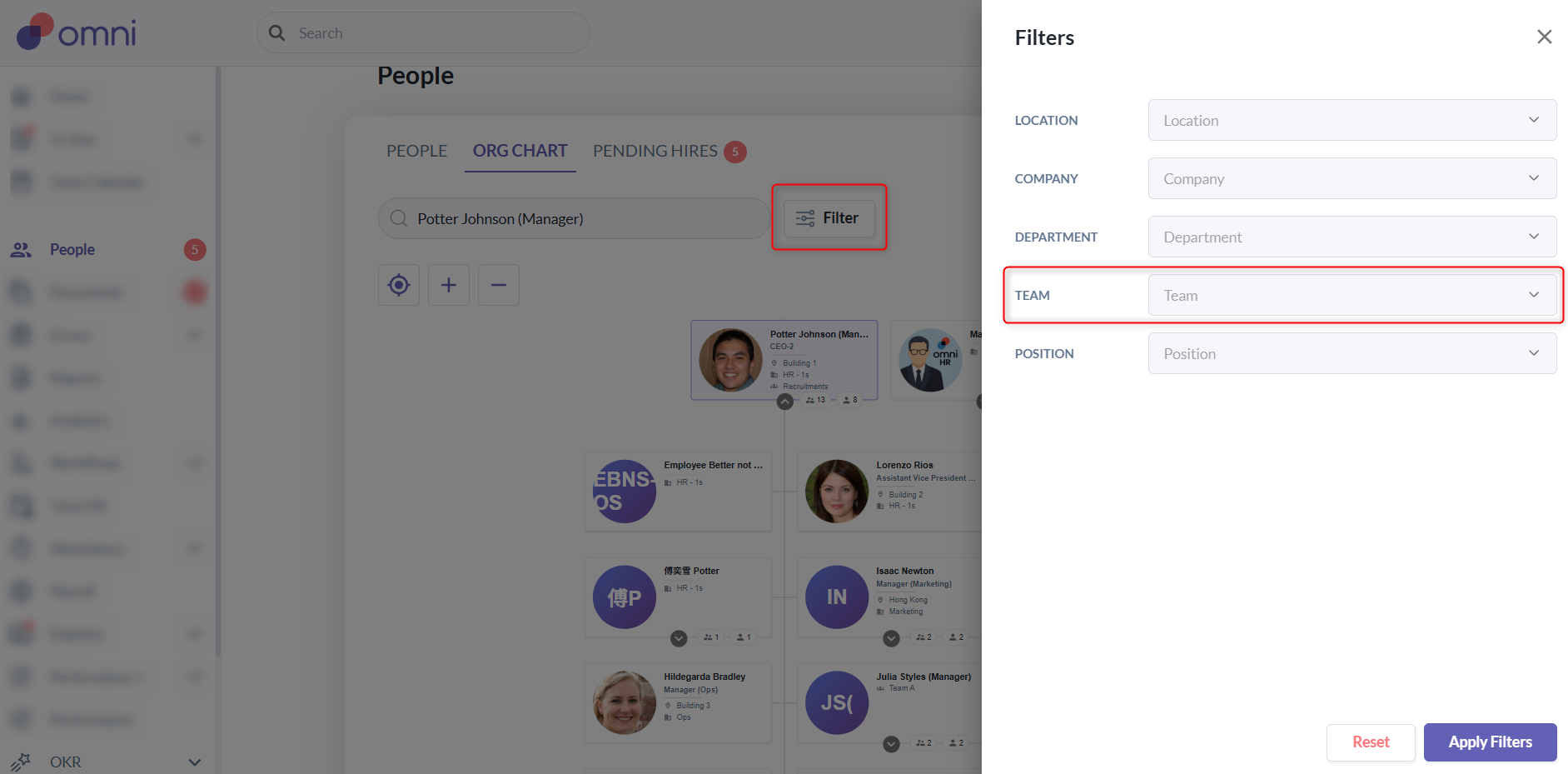 - You can use the filter function to view the org chart by: Location, Company, Department, Team (New Filter) and Position.