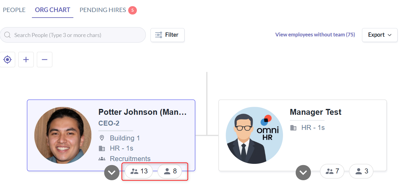 - Each employee card displays the total headcount under their reporting line, including both direct and indirect reports, giving you instant visibility into team structure.