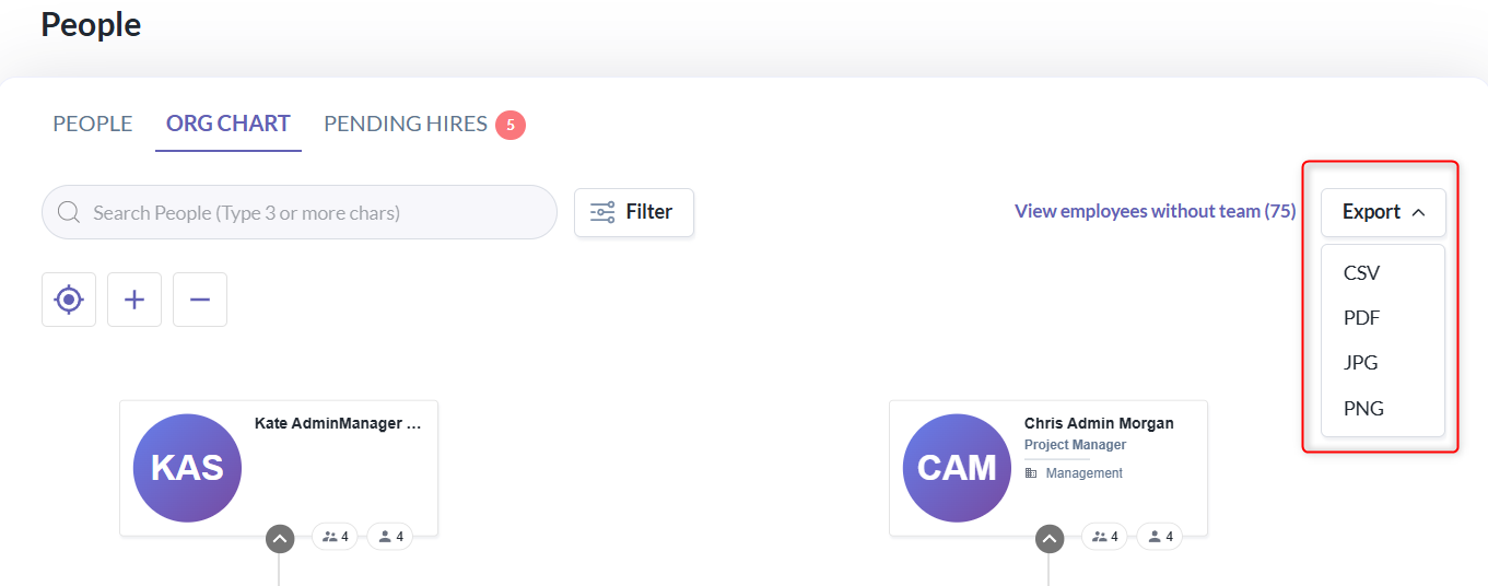 - Export your org chart in CSV, PDF, JPG, or PNG option — all in one click. Perfect for reporting, workforce planning, or deeper analysis.