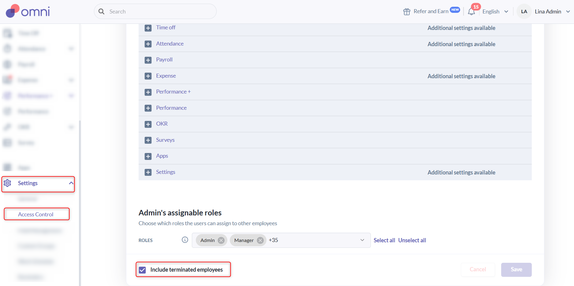 1. Go to Settings > Access Control > Select the relevant access role > Scroll to the bottom of the page and check the option “Include Terminated Employees”.