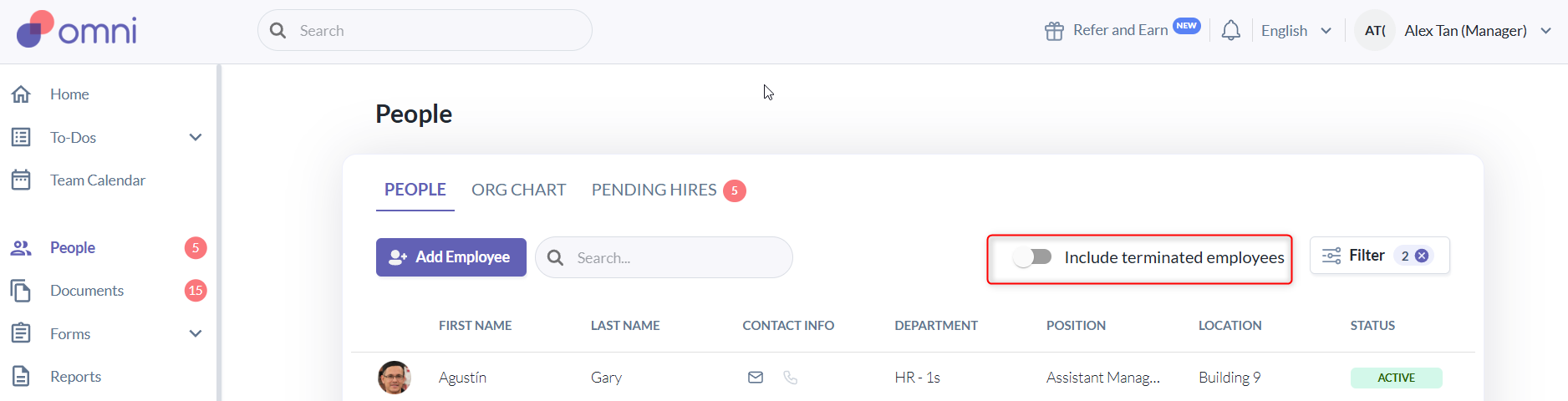- If your access role does not allow viewing terminated employees, the “Include Terminated Employees” toggle will not be visible.